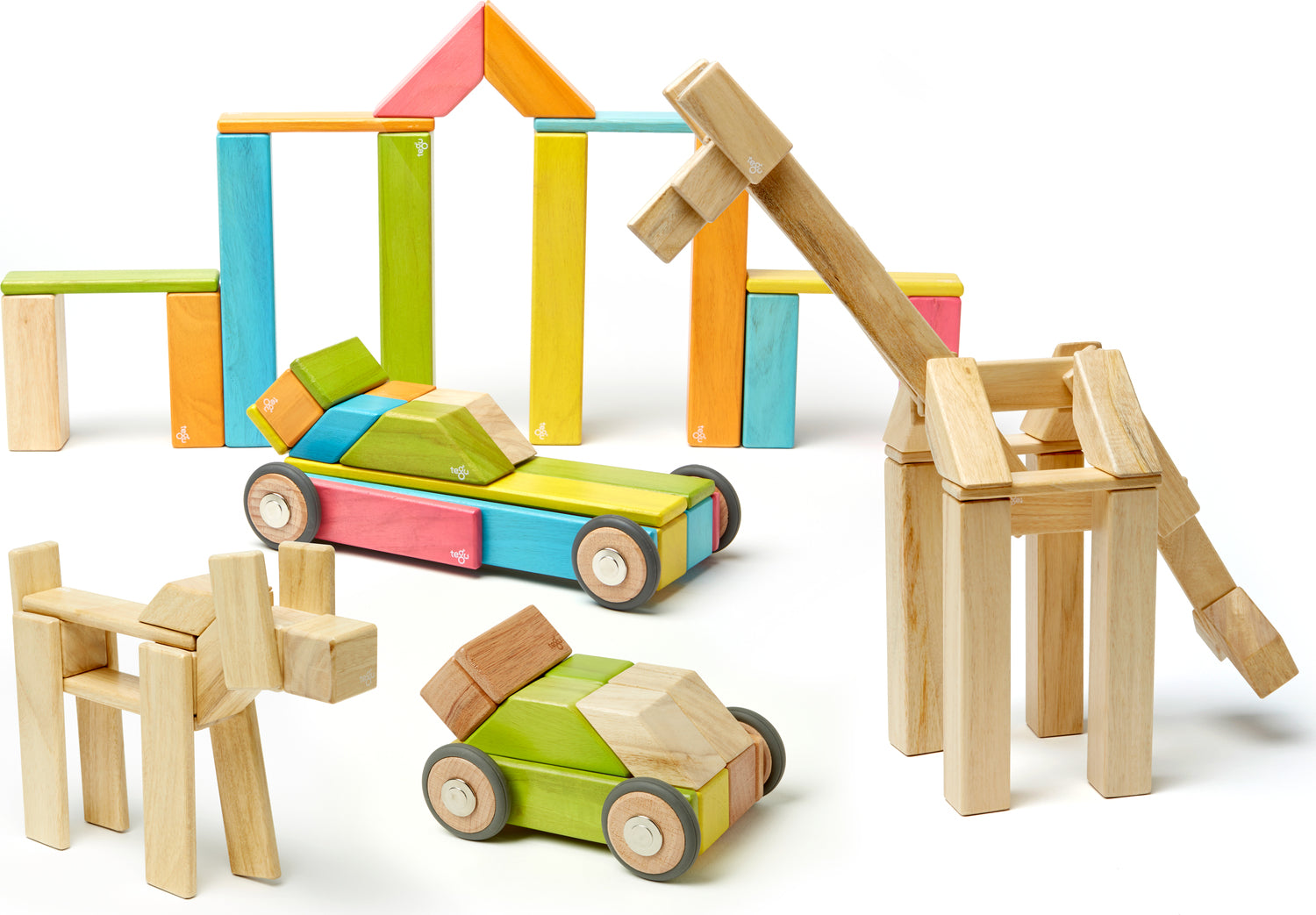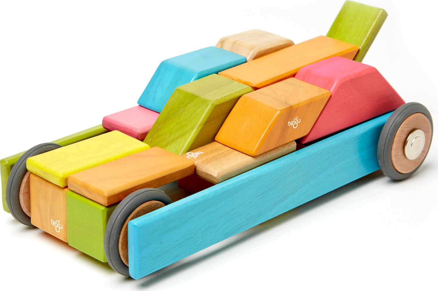 The 42-Piece Set offers the best of all Tegu has to offer. It incorporates nine unique shapes, including the wildly addictive magnetic wheels. Whether it's creating a scaling tower, a whimsical animal, or speeding away with detachable magnetic wheels, it offers limitless play to encourage the budding genius in every child. It Includes 42 blocks in nine shapes: 4 Tall Columns, 4 Medium Columns, 6 Short Planks, 6 Long Planks, 6 Mega Planks, 6 Cubes, 2 Parallelograms, 4 Short Angles, and 4 Wheels.