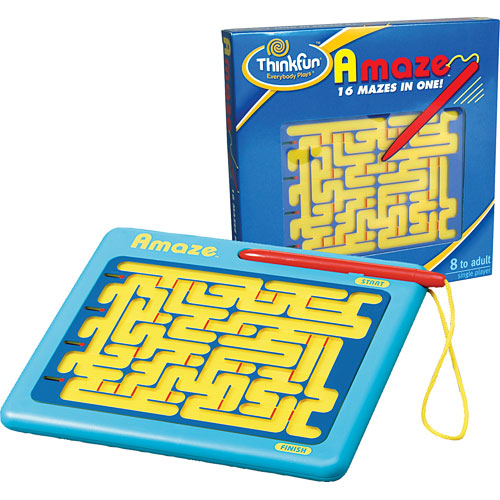In Amaze, Players must navigate through the maze with the attached stylus, pushing open movable gateways while avoiding traps and dead ends! An innovative twist on a classic maze puzzle. Amaze's diabolical shifting pathways change the solution path during play!