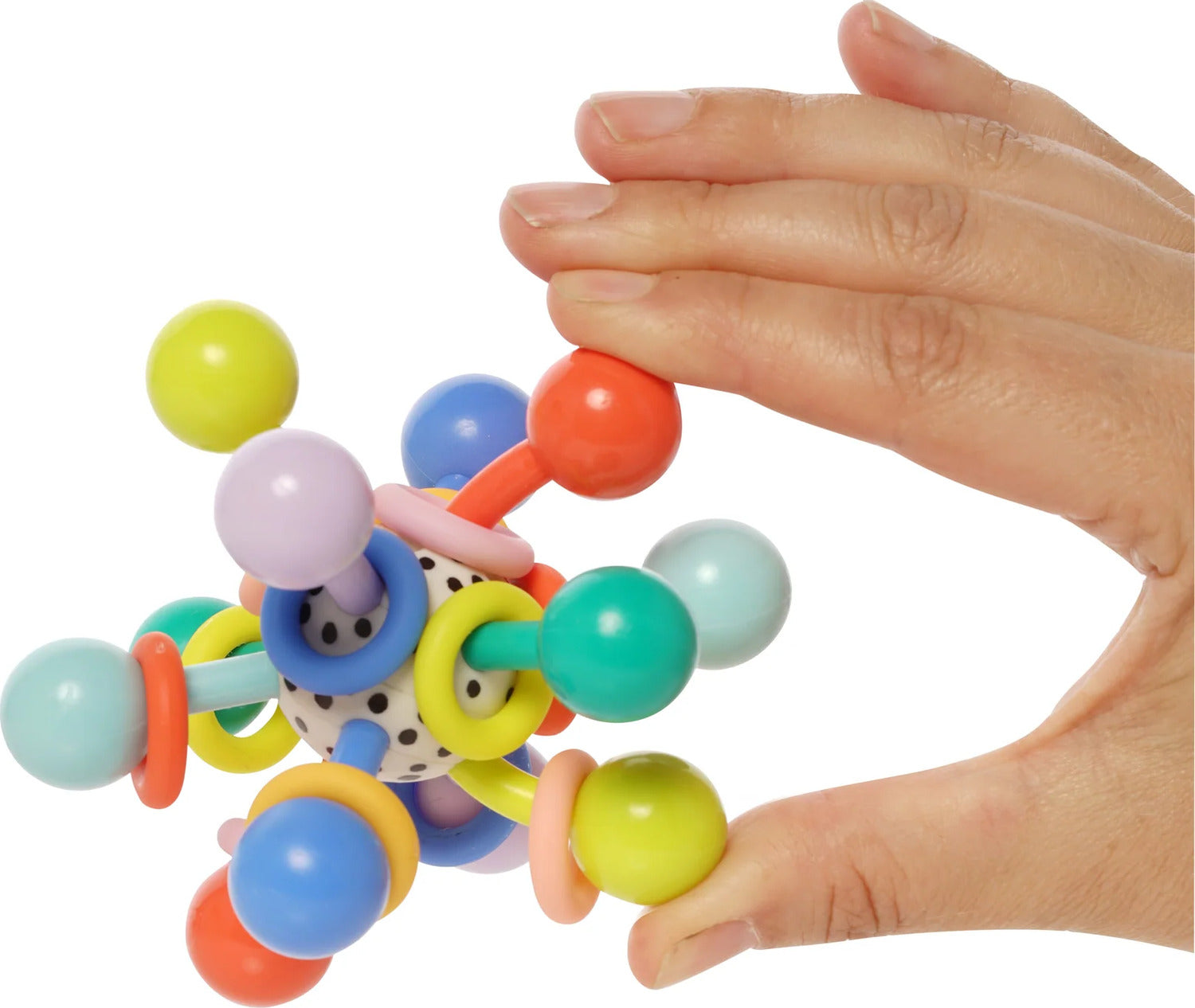 A refreshed version of our award-winning Atom rattling teether toy! Twelve colorful bendy arms with textured ends stem from the round center of this easy-to grasp teether toy.