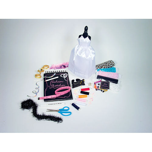 Includes trendy fabrics and accessories for fashion fun. Ultimate set contains a lace-covered dress mannequin, sewing essentials, sketch book, fabrics, swatch booklet, trims, ribbons and embellishments. 50+ pieces in all.