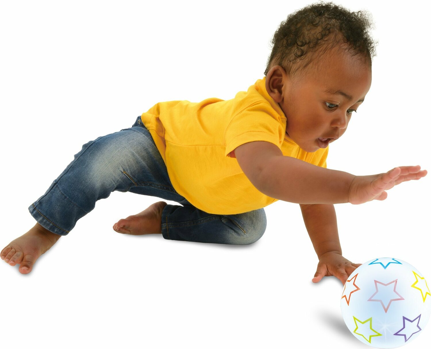 A color changing motorized ball for baby to follow as it rolls along then stops and changes direction. The ball lights up and colors change as it moves. Babies will be captivated by the random movement and changing colors. A younger baby will track the ball with their eyes and reach out for the toy. An older baby will be encouraged to crawl towards the ball.