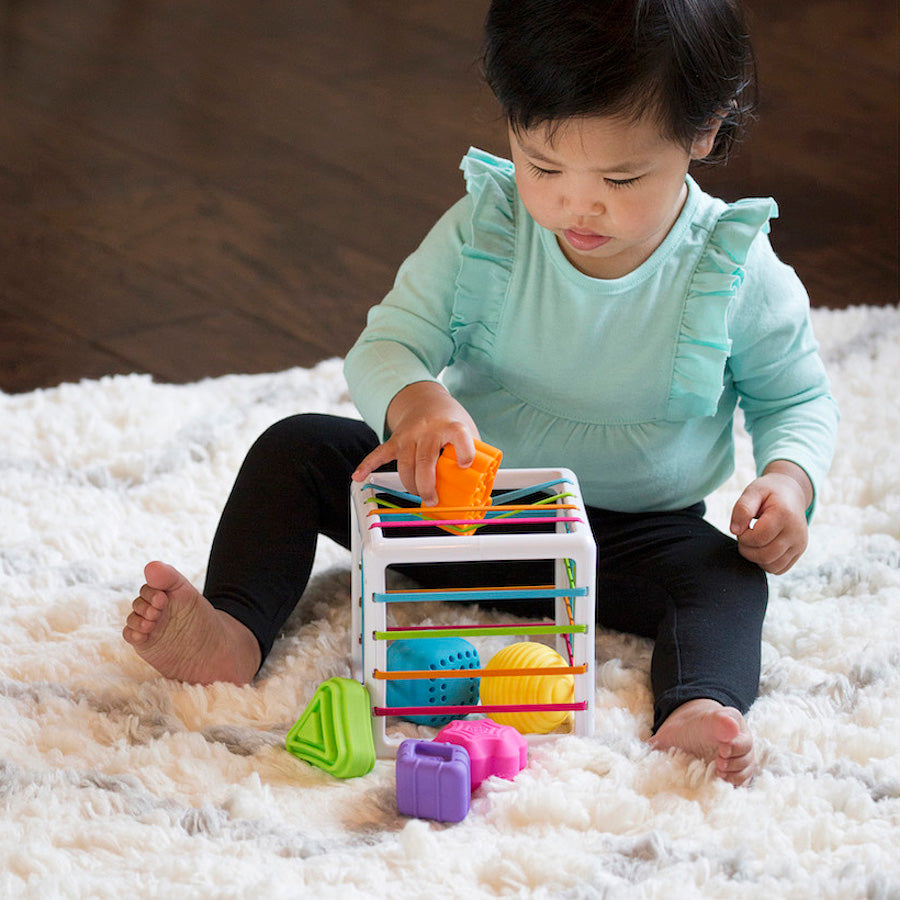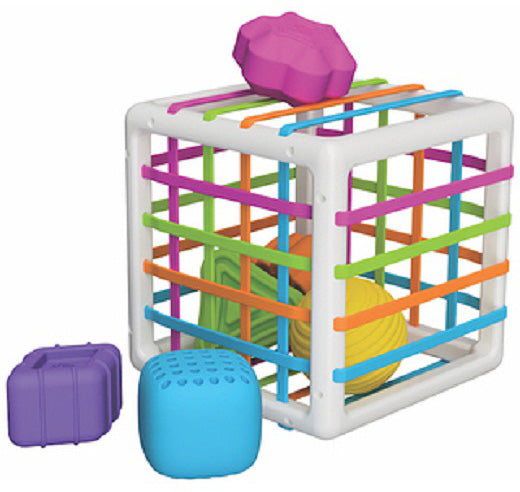 The six chunky shape blocks are each designed with fascinating textures that are sure to thrill the fingers. There's a cube, a diamond, a sphere, a triangle, a flower, and the happy Fat Brain logo... But the best part? As kids push the shapes through the elastic bands of the cube, curiosity is sparked and young minds can't help but explore, experiment, and discover. It's beautifully simple and amazingly mind-expanding! Play freely with InnyBin. InnyBin Innovative shape-sorting box Encourages fine motor skills, tactile exploration, experimentation 6 chunky, uniquely textured shapes fit through the elastic bands of the cube A tactile challenge for little ones A frustration-free shape-learning experience Shapes include cube, diamond, sphere, triangle, flower, Fat Brain logo Cube measures 5.5 x 5.5 x 5.5 inches Shapes each measure approximately 2 x 2 x 2 inches BPA-free - Exceptionally safe High-quality materials and construction - Lasting durability