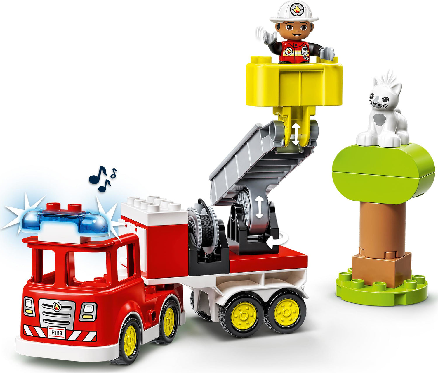 - This set includes LEGO DUPLO firefighter and cat figures, a tree and a fire engine toy with flashing lights and siren (batteries included)
