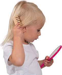 Everything needed to become the prettiest Little Miss! 9 wooden accessories: a large mirror, a makeup palette with brush and built-in mirror, 2 lipsticks, 2 nail varnishes, 1 eyeliner pencil, 1 perfume bottle, 1 brush.Delivered in a lovely vanity equipped with a metal zipper and 2 fabric handles. Accessories in solid wood. Silk-screen printing of the accessories and vanity in matt PVC. Inner cardboard wedge + hangtag fixed all around the vanity with a polybag to protect the product during transportation.