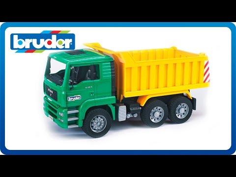 This MAN Dump Truck by Bruder is designed like thing real thing. Its features include a forward tilting cab for view of the engine block as well as foldable side view mirrors. The cargo bed tilts up and rear gate opens to unload, making it the greatest toy in the sandbox! The soft rubber-like tires are treaded and ready for play.