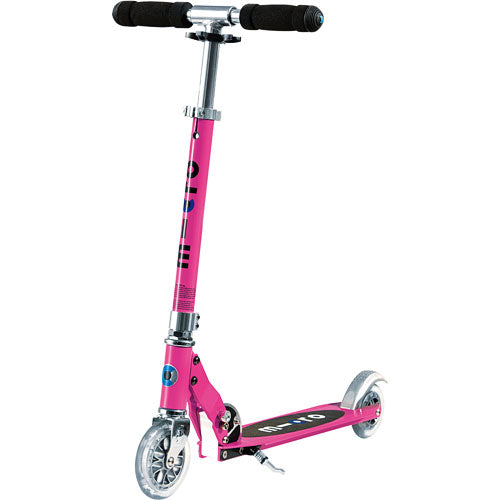 The Micro Sprite is our highest rated 2 wheel scooter for ages 8 and up. It offers a lot of Micro quality and style for a great price. With its cool colors and fantastically smooth glide, the Sprite is everyone's favorite-from middle school students to moms and commuters. The Sprite is strong and lightweight, only 5.5 lbs, with an adjustable height handle bar that extends 34" above the deck (37" above the ground) and a maximum rider load of 220 lbs. It's also a great travel and commuter scooter-it can be folded up quickly and easily for carrying or storing away, and the built-in kickstand allows quick upright "parking." Motion-activated light up wheels.