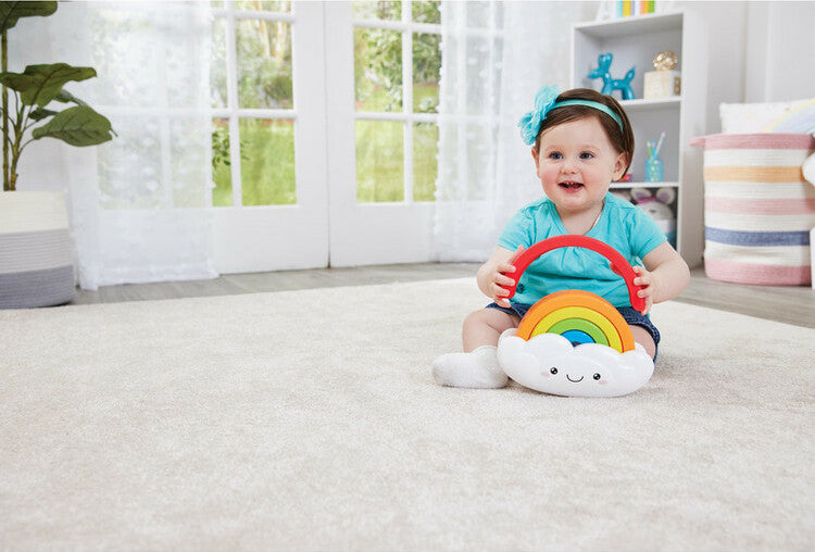 Motion activated lights and sounds for stationary play! Rock the cloud base and watch it light up and play delightful melodies including Twinkle Twinkle Little Star and You Are My Sunshine