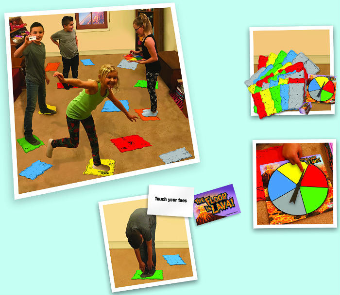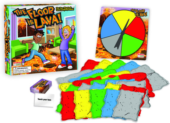 Everyone has played a version of this game as a child, most likely jumping all over the furniture in their living room trying to stay off the dangerous floor. The Floor is Lava is a game where players must imagine the floor is molten hot lava, while spinning for their color and jumping along foam game pieces in order to reach safety. The Floor is Lava is a family game incorporating physical activity, imagination and pure fun! Remember, DON’T TOUCH THE FLOOR! Contents: 25 Colored Foam "Safety Stones", 27 Challenge Cards, 1 Game spinner card (with arrow and base) and Instruction sheet. For 2-6 players. Ages 5-105.