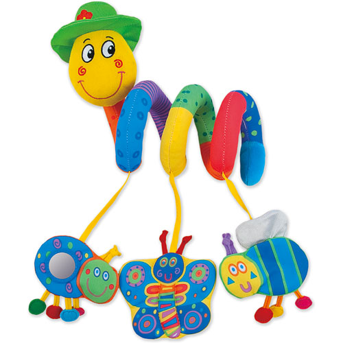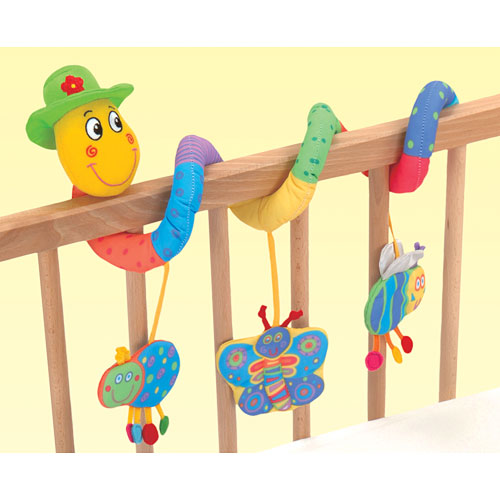 A soft friendly worm with 3 hanging toys to attach to a cot, pushchair or car seat. Wrap the coil around and secure with the fabric ties. With a crinkle hat and squeaky head plus mirror ladybird, crinkle butterfly and bee rattle toys.