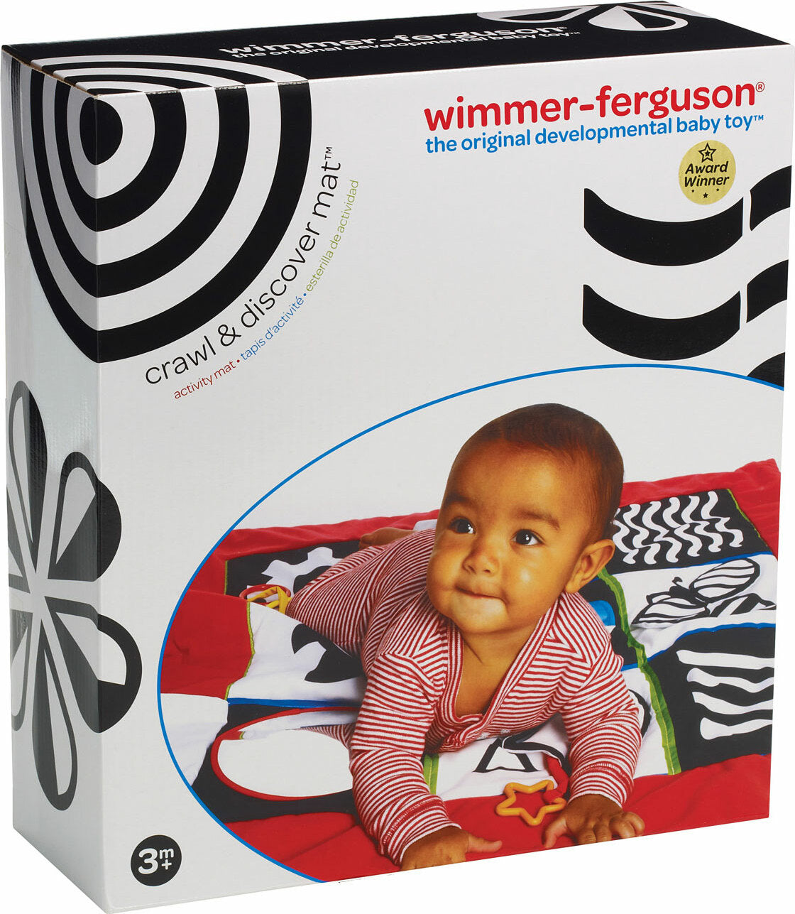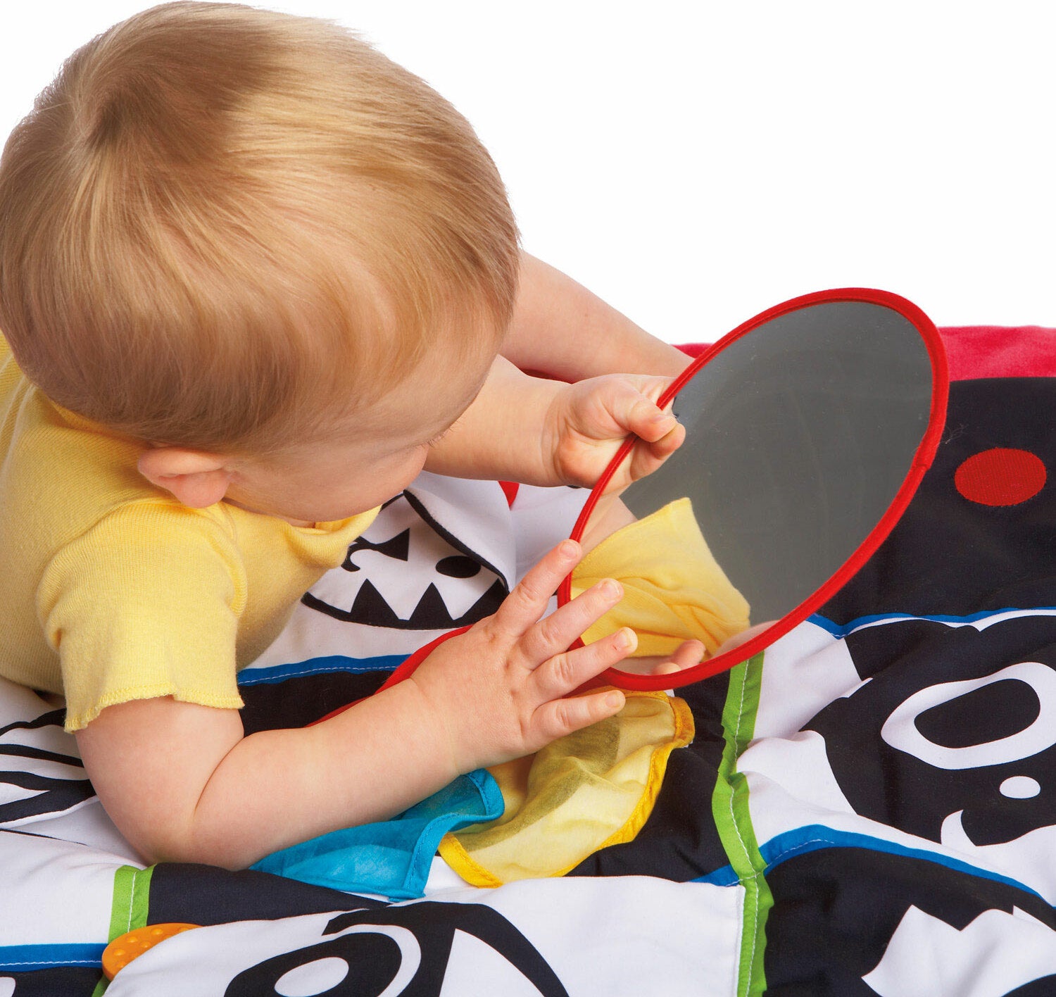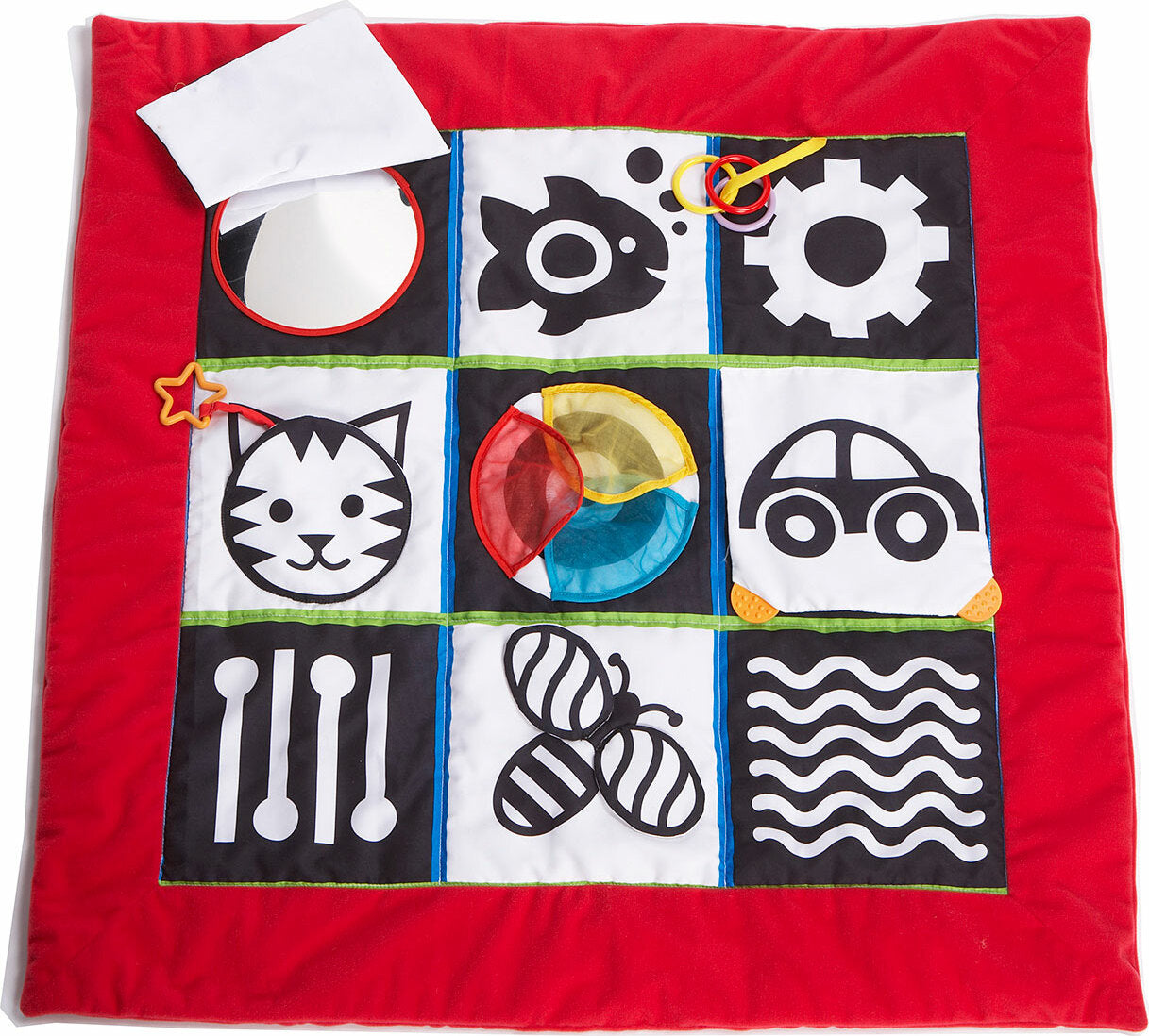 This play mat has many features for baby to discover. Flaps with reverse print graphics, various textures and crinkle paper will keep baby engaged. Plus a removable mirror that encourages self discovery, teethers and a pocket with a star shaped ring attachment.